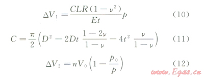 實踐中,對于式(10),由于徑向為管道壁厚方向,對于大口徑薄壁管,擘厚變化引起的管道體積變化較小,以規(guī)格為l219×22mm規(guī)格的管道為例,經(jīng)測算,僅為DVl的5%,若考慮空氣、水的壓縮性,該比例還將大大降低。因此,本文將該壁厚變化引起的體積變化忽略,得到DVl表達式為: