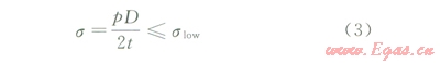 式中P為管道試壓壓力或運行壓力,MPa;D為管道外徑,m;t為管道壁厚,m;s為內(nèi)壓產(chǎn)生的環(huán)向應力,應不超過管道的屈服強度,MPa。