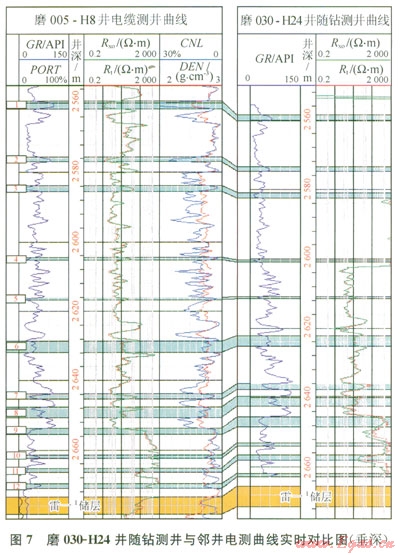 圖1是磨溪?dú)馓锬?span lang="EN-US">030-H24井的隨鉆測(cè)井與電纜測(cè)井伽馬和電阻率曲線的對(duì)比圖,從圖l中可以看出隨鉆測(cè)井與電纜測(cè)井伽馬和電阻率值均具有良好的相關(guān)性,曲線形態(tài)相同,對(duì)比性好,但電阻值由于標(biāo)定及測(cè)量環(huán)境不同的原因,值的大小有一定差異。值得注意的是由于感應(yīng)電阻率主要應(yīng)用于低電阻率地層,在電阻率較低時(shí)具有較高的測(cè)量精度,當(dāng)?shù)貙与娮杪食^(guò)較高(大于l00W·m)時(shí),測(cè)量精度下降,曲線容易發(fā)生畸變,如圖l中高電阻率地層隨鉆電阻率較大幅度低于電纜測(cè)井電阻率,因此在實(shí)際應(yīng)用時(shí)應(yīng)特別注意其對(duì)分層造成的不利影響。
