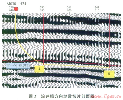 磨030-H24井井眼軌跡方向上已完鉆的磨39、158、147井連線顯示,雷一1中亞段氣藏的頂面深度在海拔-2370m附近(圖2),磨39井位于構(gòu)造低點(diǎn)附近。設(shè)計(jì)井眼方向(近正南方)造斜著陸井段和水平段前段構(gòu)造較為平緩,但水平段后段構(gòu)造相對(duì)變陡。磨030-H24井井眼方向的三維地震切片剖面(圖3),通過(guò)剖面分析看出,著陸井段所處位置地層平緩,傾角近于水平,實(shí)鉆過(guò)程中可能不會(huì)出現(xiàn)較大的地層傾角變化。