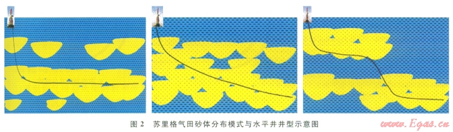根據(jù)砂體空間分布與氣層發(fā)育特征,有針一對性設(shè)計塊狀厚層砂體為平直性水平井、多層疊置型砂體為大斜度水平井和削截式分段砂體為階梯水平井3種水平井設(shè)計模式(圖2)。