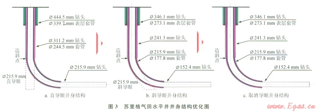 蘇里格氣田水平井鉆井經(jīng)歷斜導(dǎo)眼、直導(dǎo)眼和取消導(dǎo)眼3個階段,針對試驗期Æ311.15mm機械鉆速低、大井眼螺桿造斜率低、斜井段施工周期長、井壁穩(wěn)定性差等工程難點,通過理論研究和現(xiàn)場試驗,確定了蘇里格氣田水平井的主體井身結(jié)構(gòu)為Æ215.9mm斜井段+Æ152.4mm水平井段(圖3),既能大幅縮短鉆井周期,又能滿足目前主體改造技術(shù)要求[10]。在剖面優(yōu)化上,將剖面類型從中短半徑轉(zhuǎn)變?yōu)殚L半徑,靶前距從350m增加到450m左右,復(fù)合鉆井段70%以上,通過“上急下緩”雙增剖面,以84°左右井斜穩(wěn)斜探氣頂,使軌跡控制始終占據(jù)主動,確保準確入窗。同時,通過巖石可鉆性和鉆遇地層巖石礦物組分研究,在鉆頭結(jié)構(gòu)、水力參數(shù)、復(fù)合片性能等方面進行了個性化設(shè)計,改進流道設(shè)計和外部結(jié)構(gòu),優(yōu)選了適合于斜井段、水平段鉆井的PDC鉆頭,實現(xiàn)了PDC鉆頭全井段的應(yīng)用,提高了機械轉(zhuǎn)速,縮短了鉆井周期。