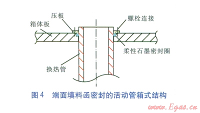 為降低成本,經(jīng)過分析研究,決定選用抗腐蝕性能高且價(jià)格低的復(fù)合管材——20號(hào)鋼管外表面鍍搪瓷,采用端面填料函密封的活動(dòng)管箱式結(jié)構(gòu)(見圖4)。