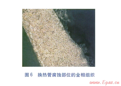鍍搪瓷鋼管穿入箱體板中,壓板擠壓柔性石墨密封圈,以填充箱體板與換熱管間的填料函起到密封作用。與整體焊接的固定管箱式結(jié)構(gòu)相比,這種結(jié)構(gòu)一是可以削弱換熱管根部承受的交變應(yīng)力,二是可有效避免焊接導(dǎo)致的管道抗腐蝕性能的降低。經(jīng)過技術(shù)改造,使用壽命提高到l0~12個(gè)月。雖然技術(shù)改造后空氣預(yù)熱器的使用壽命有了一定延長(zhǎng),但效果仍不理想。通過現(xiàn)場(chǎng)勘察,技術(shù)改造基本杜絕了換熱管主體的酸露點(diǎn)腐蝕,腐蝕主要發(fā)生在換熱管與箱體板、柔性石墨密封圈接觸的部位(見圖5)。通過對(duì)換熱管腐蝕部位的金相組織(見圖6)分析發(fā)現(xiàn),腐蝕成因?yàn)榈湫偷目p隙腐蝕[3-4]。