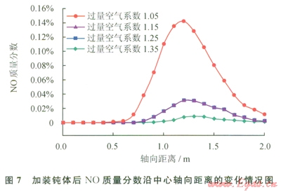 數(shù)值研究結(jié)果表明,加裝鈍體后甲烷的質(zhì)量分?jǐn)?shù)在出口處為0,加裝鈍體能夠?qū)崿F(xiàn)頁巖氣的完全燃燒。加裝鈍體優(yōu)化后,燃?xì)鈬姵龊笥龅解g體擾流,產(chǎn)生一定的回流區(qū)域,使高溫炯?xì)饣亓鳎⒓訜釀倗姵龅娜細(xì)?,使其迅速燃燒,減少了著火時間。圖7為加裝鈍體后NO質(zhì)量分?jǐn)?shù)沿中心軸向距離的變化情況,與圖4中未加裝鈍體優(yōu)化前進(jìn)行對比,加裝鈍體優(yōu)化后,在相同位置處NO的質(zhì)量分?jǐn)?shù)明顯降低,主要是由于加裝鈍體后,爐膛溫度有所降低,同時爐膛溫度較均勻。因此NO的生成量較少。