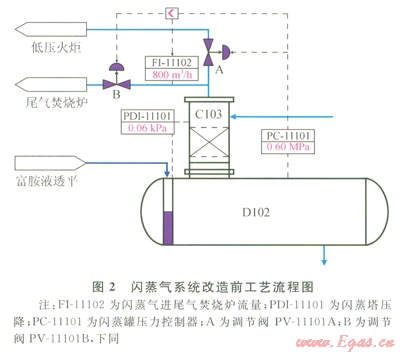 工藝改造前,來(lái)自液力透平的富胺液進(jìn)入閃蒸罐,在罐內(nèi)閃蒸出所攜帶的輕烴,閃蒸氣經(jīng)閃蒸氣吸收塔吸收所含H2S后分為兩路,一路到低壓火炬放空,另一路直接入尾氣焚燒爐F-403伴燒,其工藝流程如圖2所示。
