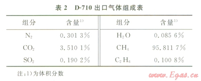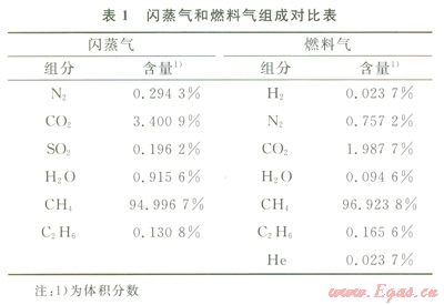 首先利用氣相色譜對(duì)閃蒸氣的組成進(jìn)行了分析,結(jié)果如表l所示。從分析結(jié)果可以看出,其主要成分是CH4,含量為94.9967%(體積分?jǐn)?shù)),通過(guò)表l的對(duì)比可以看出,閃蒸氣的組成和燃料氣的組成十分相近。