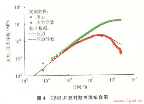 均質(zhì)地層是指均勻分布的滲流介質(zhì),視均質(zhì)地層特征曲線在形態(tài)和表現(xiàn)形式上同均質(zhì)地層一樣,所不同的是流體的儲(chǔ)滲介質(zhì)有所差異,其特征是地層有一定的自然產(chǎn)能,關(guān)井壓力恢復(fù)速度快,雙對(duì)數(shù)診斷圖上導(dǎo)數(shù)曲線具有明顯的徑向流段,能夠反應(yīng)地層內(nèi)部的滲流特征,說明儲(chǔ)層自身?xiàng)l件較好,措施效果也是幾種曲線類型中最好的,措施成功率最高[2]。