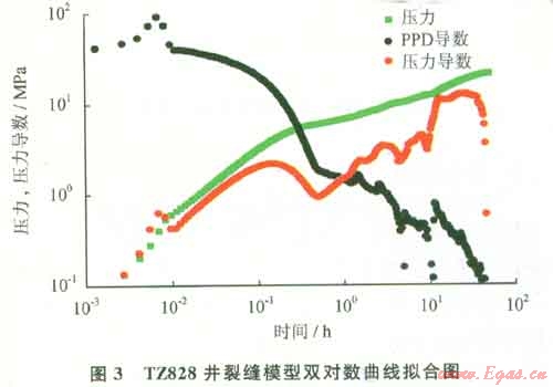 裂縫井模型也是塔中碳酸鹽巖儲(chǔ)層的主要類型之一,此類井由于基質(zhì)孔滲條件差,能量補(bǔ)給不足,相應(yīng)的產(chǎn)能低、遞減快。如TZ828井,5595~5603m儲(chǔ)層的沉積環(huán)境主要為粒屑灘、礁丘亞相,礁翼、中高能砂屑灘微相。巖性生屑砂屑灰?guī)r、層孔蟲骨架巖,含大量棘屑、發(fā)育溶洞、灰色生物礁灰?guī)r、見高角度構(gòu)造縫和蜂窩狀溶蝕孔洞??紫抖绕骄禐?.8%,儲(chǔ)層類型以Ⅰ、Ⅱ類為主。試油期間開井流動(dòng)曲線近似一條直線,開井期間地面無產(chǎn)出,表明地層無自噴能力;關(guān)井壓力曲線恢復(fù)緩慢,反映儲(chǔ)層為低滲透儲(chǔ)層。二次關(guān)井導(dǎo)數(shù)曲線后期出現(xiàn)不規(guī)則,是由于井筒相變的影響造成的,如圖3所示,試井解釋只能用10h以內(nèi)的數(shù)據(jù)。
