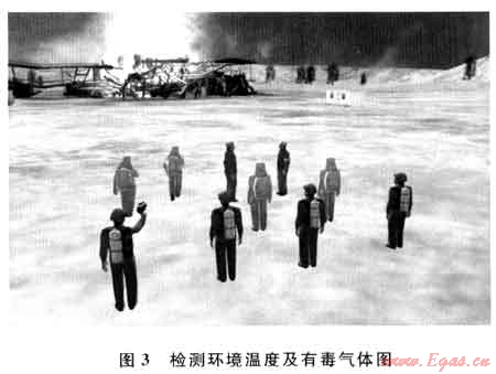 該流程是滅火搶險作業(yè)工藝流程的檢測環(huán)境溫度及有毒氣體的過程[5~7],通過仿真平臺模擬了溫度檢測及可燃?xì)怏w監(jiān)測的操作流程、同時展示了空氣呼吸器、抗高溫防火服及各種防爆工具的使用(圖3)。