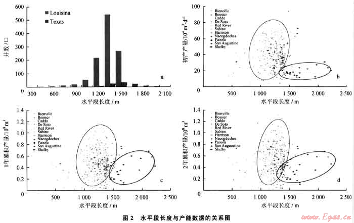 2) 水平段長度不是決定產(chǎn)能的唯一因素,也非越長越好。Louisiana和Texas州分別趨向于采用1500m和1650m水平段生產(chǎn)井開發(fā)頁巖氣。