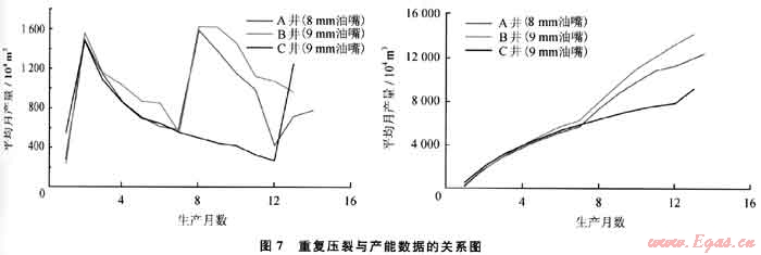 重復壓裂是有效提高頁巖氣井產(chǎn)能的增產(chǎn)方法,壓裂時機的選擇對最終產(chǎn)量的影響顯著。選取A、B、C這3口頁巖氣井進行分析,3口井完井時間相近:A、C井2009年12月完井,8井2009年11月完井。求產(chǎn)時油嘴尺寸也相近:A井8mm,B井和C井9mm。首月產(chǎn)量接近:A井1774×104m3,B井1803×104m3,C井略高于前兩者為2034×104m3。A井和8井分別在投產(chǎn)后第7個月開展重復壓裂,C井則在第12個月進行重復壓裂(圖7)。分析壓裂結果可得以下結論:①重復壓裂能夠顯著增加頁巖氣產(chǎn)量,重復壓裂后,A、B、C這3口井月產(chǎn)量均有大幅度提升;②重復壓裂時機的選擇非常關鍵,從上述3口井的結果看,重復壓裂時間越早,作業(yè)后單月產(chǎn)量和累積總產(chǎn)量越高。
