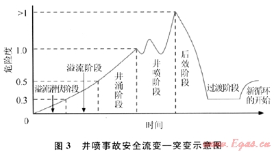 6) 從壓井成功到重新投入生產(chǎn)是過渡階段,此階段應(yīng)該采取相應(yīng)的措施以消除系統(tǒng)已存在的危險因子,待所有的危險因子消除之后,油氣井又會重新投入生產(chǎn),進(jìn)入下一個安全流變突變循環(huán)(如圖3)。圖中井噴階段以波浪線上升的原因主要是在此過程中不斷地往鉆井液中加入高密度的物質(zhì)或重漿,導(dǎo)致井內(nèi)的實時壓力不斷變化,危險度也會發(fā)生相應(yīng)的波動