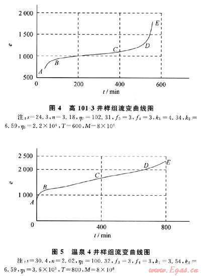 圖4中的AB段是油氣井在外界作用下的減速損傷階段,與承載的時間關(guān)系不大,為瞬間損傷。在第一保護(hù)區(qū)的作用下,損傷速度由大變小,損傷加速度小于0。BC段是油氣井等速損傷階段,此階段流變曲線形似一條直線,損傷速度接近常數(shù),損傷加速度為0。CD段是油氣井加速損傷階段,此階段損傷速度不斷增大,加速度也大于0。AD段是安全流變階段,其中D點是突變警戒點,從此點開始油氣井的運動開始發(fā)生了質(zhì)變,進(jìn)入了危險狀態(tài)。DE屬于安全突變階段。