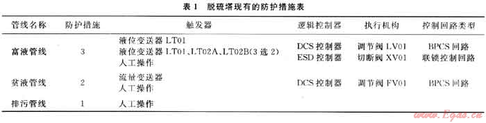 以某天然氣凈化廠的脫硫塔為例(該塔屬于重點高壓設(shè)備)。含硫天然氣在塔內(nèi)由下至上,在常溫高壓條件下脫除其中的硫化氫后從塔頂排出,脫硫溶劑貧液自塔頂往下流,吸收含硫天然氣中的硫化氫后從塔底排出,進入低壓系統(tǒng)再生。為保證高壓介質(zhì)不竄入低壓系統(tǒng),除設(shè)置脫硫塔液位調(diào)節(jié)回路外,另設(shè)置了安全聯(lián)鎖控制回路,作為重要的防護層。該裝置現(xiàn)有防護措施如表1所示。