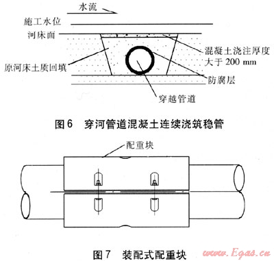 管道往往不可避免地要穿跨越城鎮(zhèn)道路、高速公路、國道(省道)、鐵路(見圖5)及江河或其他特殊設(shè)施。對于穿跨越管道,由于管道運(yùn)行后難以再實(shí)施檢修工作或檢修工作難度大、費(fèi)用高,因此管道穿跨越施工及措施的好壞直接影響著管道穿跨越的質(zhì)量。穿跨越河流段的管道(見圖6),當(dāng)河床受水流沖刷而使其覆土厚度逐漸減小,將可能造成管道懸空。對于通航河道,如果進(jìn)行疏浚或船舶拋錨時(shí),將對管道構(gòu)成危害。如果管道配重(見圖7)不足,將會造成管道的上浮而破壞。因此,應(yīng)特別注意穿越深度及穿越層的穩(wěn)定,同時(shí)應(yīng)修建適當(dāng)?shù)臉?biāo)志物、護(hù)岸、護(hù)底、配重塊等保護(hù)設(shè)施,使管道免于破壞。