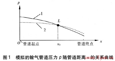 根據(jù)式(1)建立管道模型,利用SCADA系統(tǒng)同一時刻對管道兩端實(shí)時采集到的數(shù)據(jù),分別進(jìn)行兩組管道數(shù)據(jù)的仿真:由起點(diǎn)到終點(diǎn)的模型仿真和由終點(diǎn)到起點(diǎn)的模型仿真。如果管道運(yùn)行正常,則以上兩組仿真數(shù)據(jù)與實(shí)測數(shù)據(jù)偏差較小(允許相對誤差為5%[4])。但當(dāng)管道發(fā)生泄漏后,仿真數(shù)據(jù)將不能與實(shí)測數(shù)據(jù)中的1個或幾個吻合,由此可以判定管道發(fā)生了泄漏。當(dāng)天然氣在管道泄漏點(diǎn)處有相同的邊界條件時,由流體的連續(xù)性可知,泄漏點(diǎn)處的壓力和溫度也相同。因此當(dāng)管道泄漏時,根據(jù)管道起點(diǎn)邊界條件繪制的壓力曲線1和根據(jù)終點(diǎn)邊界條件繪制的壓力曲線2將相交于L點(diǎn),見圖1,此時可判定L點(diǎn)對應(yīng)的管道位置x0就是泄漏點(diǎn)位置。泄漏量為起點(diǎn)到終點(diǎn)模型仿真在泄漏點(diǎn)處的流量與終點(diǎn)到起點(diǎn)模型仿真在泄漏點(diǎn)處的流量之差。
