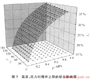 圖3給出了溫度和壓力對爆炸上限的綜合影響??梢钥闯鲭S著溫度、壓力的提高,爆炸極限范圍增大。在同一溫度下,壓力由0.1MPa升高到1.0MPa,其爆炸極限由15.14%擴大到35.74%。在同一壓力下,溫度由25℃升高到160℃,低壓時,爆炸上限幾乎沒有變化;在高壓時,爆炸上限由34.79%上升至35.74%??梢妷毫Ρㄉ舷薜挠绊懮跤跍囟葘ζ涞挠绊憽R虼?,在煤層氣的工業(yè)生產(chǎn)中,應盡可能在低壓下操作。