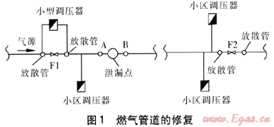 燃氣管道的修復(fù)見圖1。修復(fù)作業(yè)開始前,做好以下準(zhǔn)備工作:①在泄漏點兩側(cè)管道上各鉆1個工作孔(A、B)并裝上閥門備用,一般要求工作孔距泄漏點不小于500mm,孔徑為4mm或50mm。②將F1閥門兩側(cè)的放散管相連,并在連接處安裝小型調(diào)壓器。當(dāng)泄漏管段壓力較低時,利用小型調(diào)壓器補氣,控制泄漏管道內(nèi)的壓力,保證不放空管道形成負壓,而且要在低壓管網(wǎng)壓力低于588Pa時對各小區(qū)進行補氣。