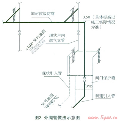 針對(duì)老舊小區(qū),戶內(nèi)立管往往位于居民室內(nèi)裝修或者包封內(nèi),改造難度較大或者不存在改造的可能性,可采用將引入管改至與首層立管相接處的方式,而不改造原有燃?xì)饬⒐堋H绻嬖诘厣弦肟诒徽級(jí)旱那闆r,而且占?jí)何锊槐阌诓鸪龝r(shí),可采用樓前管采用外爬墻方式敷設(shè),外爬管在樓房燃?xì)饬⒐芩趥?cè)爬至二層樓的0.5m高處,分別與現(xiàn)狀燃?xì)饬⒐芟嘟?,如圖3所示。