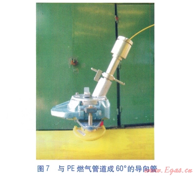 改進后的CCTV檢查系統(tǒng)借鑒了PE燃氣管道帶壓不停氣連接技術[2],采用內直徑較大的鞍形帶壓接頭(見圖6)、WASK帶壓鉆孔底座(見圖6)、與PE燃氣管道成60°的導向管(見圖7),可允許直徑為24、35、50mm的攝像頭按設定方向順利進入PE燃氣管道內。由于采用了大規(guī)格攝像頭,電纜線的直徑由4.5mm增至7.4mm,解決了攝像頭無法順利通過90°電熔彎頭的問題。