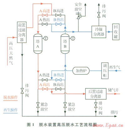 脫水操作流程:被壓縮后的高壓天然氣經(jīng)前置過濾分離器分離可能存在的游離水、油和雜質(zhì),然后經(jīng)A高進閥從塔A頂部進入,與塔內(nèi)分子篩充分接觸,分子篩吸附高壓天然氣所含的水和部分烴得到干燥的天然氣,干燥后的天然氣從塔A底部排出,經(jīng)A高出閥進入后置過濾分離器分離后進入高壓儲氣容器。后置過濾分離器主要濾掉氣流中攜帶的分子篩粉末,以免堵塞后續(xù)設(shè)備。