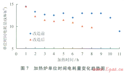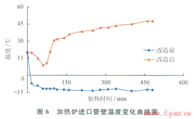 分析上述圖表數(shù)據(jù)可以得出:①改造后加熱時間減少了27.3%,再生氣用量減少了18.4%,加熱爐電耗量減少了28.6%;②由于再生氣余熱是一個自身循環(huán)預(yù)熱的過程,大約lh之后,換熱爐才開始對再生氣預(yù)熱,隨后加熱爐進口溫度緩慢升高,最后管壁溫度穩(wěn)定在47℃左右;③再生氣余熱利用存在滯后,隨著換熱器逐漸換熱,加熱爐單位時間電耗量相比改造前電耗減小,充分說明再生氣余熱得到利用,達到了節(jié)能運行的目的。