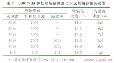 TD017-H4井固井前,對污染的鉆井液加入生石灰進(jìn)行過飽和高鈣處理,同時配制先導(dǎo)液和隔離液,較好滿足鉆井液與水泥漿之間的相容性實(shí)驗(yàn)要求(表7、8)。