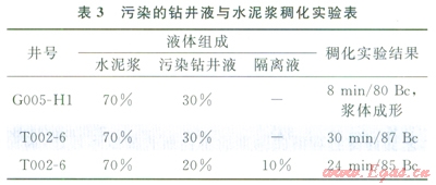 在CO2對鉆井液污染嚴(yán)重的情況下,為保證固井施工安全,有條件的情況下可以對鉆井液進(jìn)行全井或部分置換,防止鉆井液與水泥漿間接觸而提前稠化,影響固井施工安全。G00l-H5井固井前,井漿黏度和切力較高、循環(huán)壓耗大,在多次處理鉆井液不能滿足固井施工要求情況下,利用儲備鉆井液處理后對原井漿進(jìn)行全井替換,并配置抗鈣新鉆井液作為隔離液,滿足了兩相或多相相容性實(shí)驗(yàn)要求(表5、6)。