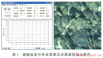 準確鑒別巖屑,正確識別出地層巖性是儲層評價的首要條件,并可根據(jù)鑒別結(jié)果直接篩除掉非儲層巖性段(頂部石膏和底部石灰?guī)r)。為了準確識別巖屑巖性,在利用遲到時間實測法對巖屑進行了準確歸位后,采用碳酸鹽巖分析儀對巖屑進行逐米鑒別,并結(jié)合巖屑顯微放大掃描對巖屑巖性、顆粒及儲集空間特征進行分析(圖1)。實鉆過程中,通過多種巖屑識別方法的綜合運用,該井巖屑識別較為準確并與隨鉆伽馬具有較好的對應(yīng)性。