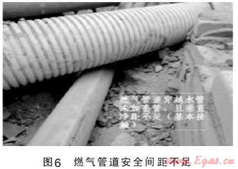 在燃?xì)夤艿朗┕み^程中,因施工單位人員、現(xiàn)場(chǎng)監(jiān)理人員以及建設(shè)單位現(xiàn)場(chǎng)管理人員對(duì)燃?xì)夤艿腊惭b施工質(zhì)量監(jiān)管不到位,施工經(jīng)驗(yàn)不足或者根本不懂燃?xì)夤艿朗┕さ闹匾?,不按照燃?xì)庑袠I(yè)國家規(guī)范和行業(yè)標(biāo)準(zhǔn)嚴(yán)格操作和監(jiān)管,產(chǎn)生一系列施工質(zhì)量隱患。如鋼管防腐處理不到位、閥井內(nèi)波紋補(bǔ)償器受外力安裝偏斜或不同軸,電熔管件焊接焊口冷卻采取沖水冷卻方式,PE管道運(yùn)輸、搬運(yùn)造成管壁劃傷嚴(yán)重超標(biāo)等人為因素,給城市燃?xì)夤艿腊踩\(yùn)行種下了一顆顆定時(shí)炸彈(如圖3、4、5)。
