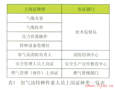 根據(jù)國家相關(guān)法律法規(guī)要求,加氣站特種作業(yè)人員還必須做到持證上崗,應(yīng)取得的上崗證及發(fā)證部門見表1。