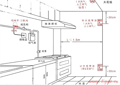 該探測器可以安裝在氣瓶輸出的瓶組間,也可以安裝在使用氣體的廚房間,如果是液化石油氣,氣體探測器安裝在離地面30公分處。(因為液化石油氣比空氣重,發(fā)生泄漏以后氣體下沉)使用天然氣就要安裝在天花板或則用氣設(shè)施的上方。探測器可以調(diào)整和設(shè)定燃?xì)鉂舛葓缶瘮?shù)值。一般可以設(shè)定在15%,一旦氣體濃度達(dá)到15%。探測器,自動輸出一個開關(guān)信號??梢钥刂茩C(jī)械手動作關(guān)閉多個進(jìn)氣閥門。同時可以控制開啟防爆排風(fēng)扇工作。通過安裝的無線發(fā)射器,控制放置在收銀臺(可以保證長期有人在場)和廚房間的語音報警器發(fā)出:“氣體發(fā)生泄漏,已經(jīng)切斷了氣源。請立即派人處理。