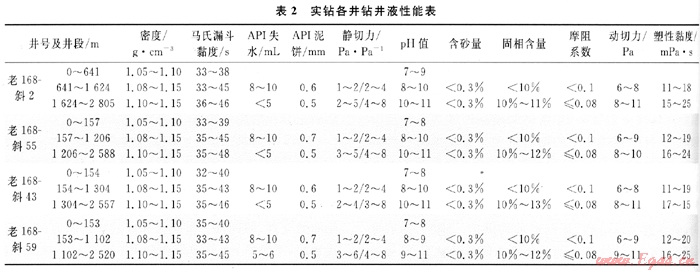 所采取的具體措施:①該叢式井組第一次開鉆采用老漿開鉆,小循環(huán)鉆進,向鉆井液中不斷補充天然高分子強抑制性包被絮凝劑(IND-30)及高分子包被絮凝劑(ZH-O2),利用高分子聚合物的絮凝作用及聚合物間的交聯(lián),協(xié)同能力提高鉆井液的抑制能力;②對于淺地層(平原組)大井眼定向的井(如老168-斜55、老168-斜43、老168-斜59井),當(dāng)井斜達到30°左右時及時混入原油,并根據(jù)進尺情況加以補充,以提供足夠的潤滑性來降低摩阻及扭矩;③鉆進過程中保持足夠的排量(≥55L/s),充分清洗井眼攜帶巖屑;④鉆完第一次開鉆井深,用前井回收的老漿并加入2%的白油封裸眼井段,確保表層套管的順利下入。