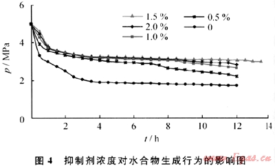 抑制劑濃度為1.5%時(shí)抑制效果最好,抑制時(shí)間達(dá)到12.5h。如圖4所示,壓力在反應(yīng)初始有一個(gè)急劇下降的過(guò)程。與純水體系相比,動(dòng)力學(xué)抑制劑體系壓力下降要小一些。而且動(dòng)力學(xué)抑制劑體系中,初始階段的壓力下降并未見(jiàn)有水合物生成,這是由于定容反應(yīng)釜內(nèi)氣體平衡、溶解,氣量減少,壓力下降,并不是由水合物生成造成,隨后由于抑制劑的抑制作用,壓力基本保持不變。