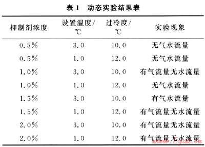 為了更好地模擬現(xiàn)場(chǎng)的真實(shí)情況,評(píng)價(jià)抑制劑的抑制性能,為現(xiàn)場(chǎng)提供正確指導(dǎo),模擬井筒和長(zhǎng)輸管線中的水合物堵塞情況,進(jìn)行了不同過(guò)冷度、不同抑制劑濃度下的流動(dòng)實(shí)驗(yàn),研究不同濃度的抑制劑的抑制效果。實(shí)驗(yàn)共測(cè)定了4個(gè)濃度、2個(gè)過(guò)冷度下的水合物堵塞情況,其結(jié)果如表1所示。