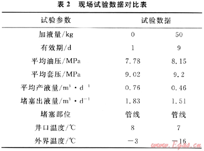 第二階段(加注新型抑制劑50kg)。除15日產(chǎn)液1.51m3,其余時(shí)間產(chǎn)液相對(duì)較少,且從12日起,溫度開(kāi)始持續(xù)降低,15日堵塞當(dāng)天最低溫度為-18℃,最高溫度也才6℃。分析認(rèn)為,造成堵塞的原因?yàn)槌鲆毫客蝗辉龃笫沟靡种苿┰诋a(chǎn)出液中的濃度降低,再加外界溫度很低,從而造成連續(xù)堵塞。即使如此本階段在加注新型抑制劑后,有效抑制期依然有9d,可見(jiàn)效果較好,其試驗(yàn)數(shù)據(jù)對(duì)比結(jié)果如表2所示。