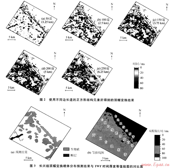 最終選取邊長(zhǎng)為150道的結(jié)構(gòu)元素進(jìn)行頂帽變換,其結(jié)果如圖3-a所示。由該圖可知,研究區(qū)內(nèi)長(zhǎng)興組總共發(fā)育有110多個(gè)礁體,礁體尺寸大小不等,小的數(shù)百米,大的逾5km;礁體主要分布于研究區(qū)中部,呈北西 南東向展布。這一結(jié)果與時(shí)間厚度圖(圖3-b)所揭示的規(guī)律相同,但直接根據(jù)厚度圖很難明確地區(qū)分出各個(gè)礁體的具體位置和分布范圍。