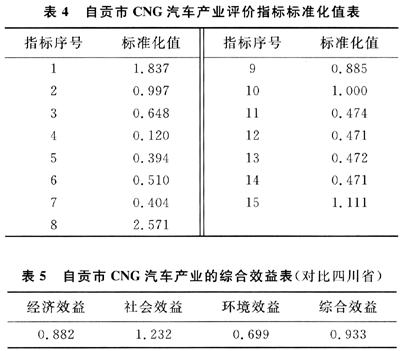按上述評(píng)價(jià)模型,將2007年自貢市CNG汽車(chē)產(chǎn)業(yè)評(píng)價(jià)指標(biāo)標(biāo)準(zhǔn)化,其結(jié)果如表4。綜合效益計(jì)算結(jié)果見(jiàn)表5。