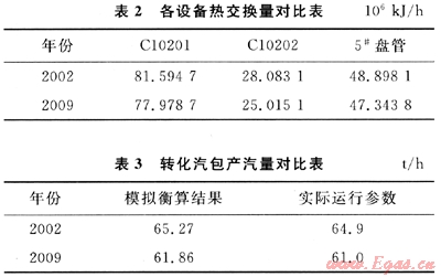 比較表3中轉(zhuǎn)化汽包模擬產(chǎn)汽量和實際產(chǎn)汽量,可判斷:C10201、C10202、5#盤管以及相應(yīng)的管道存在一定的熱損失,且2009年的熱損失明顯高于2002年,這是設(shè)備、管道的保溫效率下降所導致的。