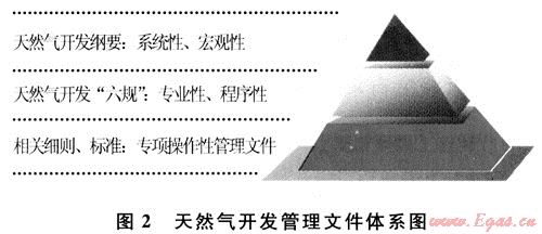 在借鑒國(guó)外天然氣開發(fā)理念和總結(jié)數(shù)十年開發(fā)經(jīng)驗(yàn)教訓(xùn)的基礎(chǔ)上,編制并頒布實(shí)施《天然氣開發(fā)管理綱要》,并構(gòu)建了以該《綱要》為主的3個(gè)層次天然氣開發(fā)管理文件體系(見圖2):①系統(tǒng)性、宏觀性的管理文件;②專業(yè)性、程序性的管理文件;③專項(xiàng)操作性的管理文件。管理文件體系的建立,對(duì)天然氣開發(fā)全過程提出明確要求,進(jìn)一步規(guī)范了天然氣開發(fā)各項(xiàng)管理工作,理順各專業(yè)管理工作界面和關(guān)系,明確了氣田開發(fā)各階段的主要工作內(nèi)容、程序和技術(shù)要求,形成不同層次管理人員和各環(huán)節(jié)現(xiàn)場(chǎng)操作人員操作程序與技術(shù)標(biāo)準(zhǔn)。天然氣開發(fā)全面實(shí)現(xiàn)制度化、科學(xué)化、全過程可控化管理。