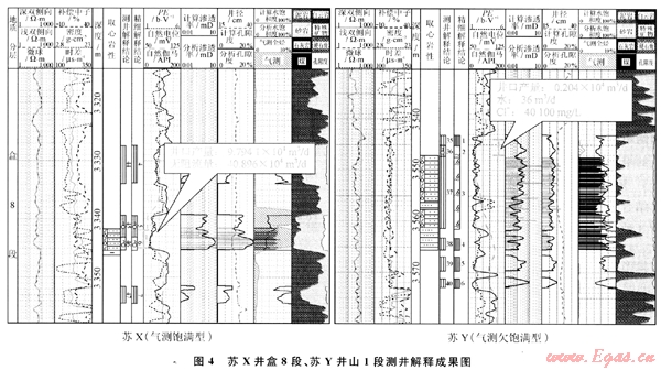蘇X井盒8段(圖4),峰形飽滿,全烴顯示厚度比儲(chǔ)層厚度大,氣測解釋為氣層,電測解釋氣層,綜合分析解釋為氣層,試氣獲無阻流量9.7914×104m3/d的工業(yè)氣流。蘇Y井山1段(圖4),全烴峰值顯示較低,峰形不飽滿,全烴顯示厚度小于儲(chǔ)層厚度,氣測解釋為氣水同層,電測解釋為差氣層,綜合分析為氣水同層。經(jīng)測試井口產(chǎn)量0.035 4×104m3/d,水36m3/d,驗(yàn)證了利用聲波時(shí)差 電阻率圖版法與氣測綜合分析判斷識(shí)別氣水層的準(zhǔn)確性。