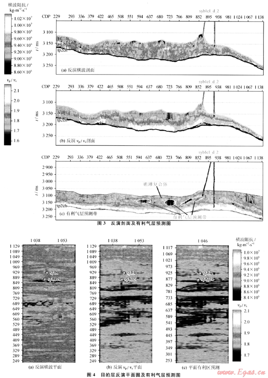 從反演結(jié)果(圖3-a,圖3-b,圖4-a,圖4-b)以及井曲線的敏感屬性分析可以得到,syb1井在目的層段的多種屬性基本上表現(xiàn)出不是良好的儲(chǔ)氣層段,而 syb1c1井的井底位置恰好在多種屬性分析上都表現(xiàn)出是良好的儲(chǔ)氣層段。這也直接驗(yàn)證了syb1井是低產(chǎn)井,而syb1c1井是一個(gè)高產(chǎn)氣井的客觀事實(shí)。對(duì)于本區(qū)含氣儲(chǔ)層段,橫波阻抗和vp/vs屬性是檢測(cè)氣藏非常好的2個(gè)參數(shù),因此,選擇橫波阻抗和vp/vs屬性體進(jìn)行有利氣層預(yù)測(cè)。圖3-c和圖4-c是有利氣層預(yù)測(cè)的過(guò)井剖面圖及目的層平面上有利氣層預(yù)測(cè)圖。