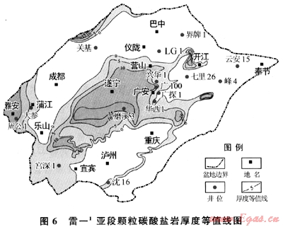 綜上所述,上述2套儲(chǔ)層的發(fā)育條件和區(qū)域分布不同,風(fēng)化殼型巖溶儲(chǔ)層受微相和巖溶作用的控制,縱向上分布在風(fēng)化殼下數(shù)十米范圍內(nèi),平面上分布于有利巖相和有利巖溶古地貌單元疊合部位,初步預(yù)測(cè)LG-營(yíng)山-西充-遂寧是勘探有利區(qū),勘探面積約2×104km2;顆粒白云巖儲(chǔ)層主要受微相控制,雷一顆粒灘分布于川中磨溪-廣安地區(qū),面積約1×104km2;雷三顆粒灘分布于龍門山前帶,面積約8000km2。