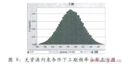 可知,模擬工期分布范圍為[177,214],平均值為200;由表3可知,資源約束條件下蒙特卡洛計算所得模擬工期分布范圍為[172,210],平均值為194,該方法所得模擬工期方差為l6,小于無資源約束條件下模擬工期方差21。這是因為考慮資源約束條件后,各活動歷時隨機浮動的同時受到了資源的約束,所以其浮動變小了,對項目工期的浮動的貢獻有了一定的消減作用,充分體現(xiàn)了資源在項目中的重要地位。同時,本項目實際完成時間為193天,顯然資源約束條件下模擬工期平均值更接近實際項目工期。因此,從IT項目實際情況出發(fā),考慮資源約束的模擬能更準確地預測項目工期,有更強的實用性。
