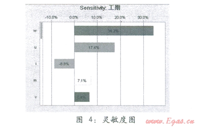 靈敏度圖(圖4)給出了各個假設(shè)單元格(即活動歷時)及該單元格與預測單元格(項目工期)的相關(guān)聯(lián)系數(shù),關(guān)聯(lián)系數(shù)顯示了活動歷時與項目工期之間的依存關(guān)系的強度。