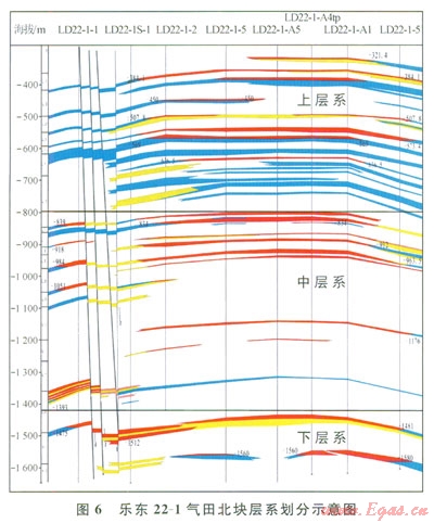 樂東22-1氣田儲(chǔ)層為第四系樂東組和新近系鶯歌海組,從上到下依次為樂東組一段、二段、三段和鶯歌海組一段,埋深350~l600m,地層壓力4.0~16.2MPa。天然氣純烴含量樂東組相近,平均為82%,而鶯歌海組則分布較為復(fù)雜,明顯具有分區(qū)分塊性。驅(qū)動(dòng)類型方面,除樂東組一段為底水驅(qū)動(dòng)外,其他均為層狀邊水驅(qū)動(dòng)。儲(chǔ)層物性上Ql1V下氣組屬中高孔高滲氣藏,其他氣組均屬中孔中低滲氣藏。儲(chǔ)量規(guī)模上Ql1V上、Ql1V下、Ql2Ⅲ、N2y1Ⅰ及N2y1Ⅱ氣組較大。因此,根據(jù)氣田縱向上各氣組的壓力、天然氣組分、驅(qū)動(dòng)類型、儲(chǔ)量規(guī)模等差異,通過合理劃分層系來減少多層合采帶來的層間干擾[9],將氣田劃分為3套層系,圖6為氣田北塊層系劃分示意圖,上層系為Ql1Ⅱ—Ql1Ⅳ,中層系為Ql2Ⅰ—Ql3Ⅱ,下層系為N2y1Ⅰ—N2y1Ⅱ。