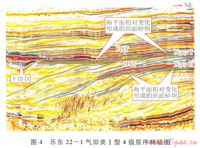 樂東22-1氣田主物源來自北東方向的海南島,為發(fā)育在陸架濱 淺海背景下,受沉積坡折控制的灘壩復(fù)合體沉積。儲(chǔ)層的形成,與海平面短期快速升降、強(qiáng)制性海退背景下形成的4級層序有關(guān)。4級層序界面以類工型界面為主,層序結(jié)構(gòu)主要表現(xiàn)為前積型特征,頂積層較薄(圖4)。S型疊加4級層序的頂積層可形成良好的儲(chǔ)集層,在沉積坡折以下多以淺海相泥巖、泥質(zhì)粉砂巖為主,儲(chǔ)層不發(fā)育(圖5)。準(zhǔn)確把握層序形成機(jī)制和疊加樣式[7-8],可以有效地預(yù)測和把握有利儲(chǔ)層的分布,減少儲(chǔ)層預(yù)測上的失誤,降低風(fēng)險(xiǎn)。通過對儲(chǔ)層的精細(xì)描述,刻畫有利砂體的展布,指導(dǎo)生產(chǎn)井的部署和井位優(yōu)化。