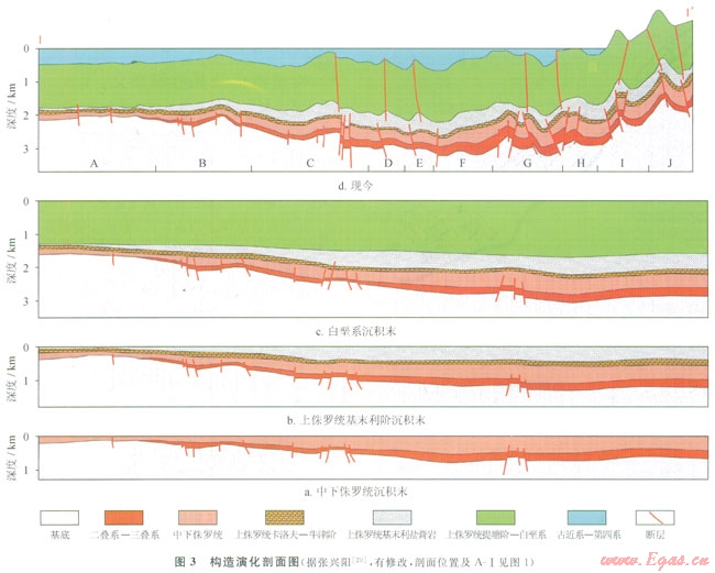 侏羅系—白堊系繼承了二疊系—三疊系的構(gòu)造格局,地層厚度由西向東逐漸增厚,具有填平補(bǔ)齊特征,別什肯特坳陷區(qū)和基薩爾褶皺隆起區(qū)沉積厚度大,斷裂不發(fā)育(圖3-c、3-b),召拉麥爾根隆起為繼承性隆起區(qū),別什肯特坳陷及鄰區(qū)保持了二疊紀(jì)—二徑紀(jì)裂陷期構(gòu)造格局,沒有發(fā)生大的構(gòu)造運(yùn)動。
