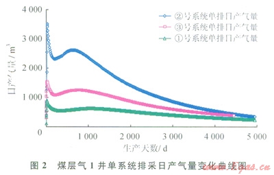 單獨(dú)排采①號系統(tǒng),產(chǎn)氣量介于306~905m3/d,平均為431m3/d(圖2),15a排采的累計產(chǎn)氣量為2.13×106m3(表2);單獨(dú)排采②號系統(tǒng),產(chǎn)氣量介于502~2952m3/d,平均為lll7m3/d,15a排采的累計產(chǎn)氣量為5.53×106m3;單獨(dú)排采③號系統(tǒng),產(chǎn)氣量介于413~l486m3/d,平均為721m3/d。15a排采的累計產(chǎn)氣量為3.57×106m3。